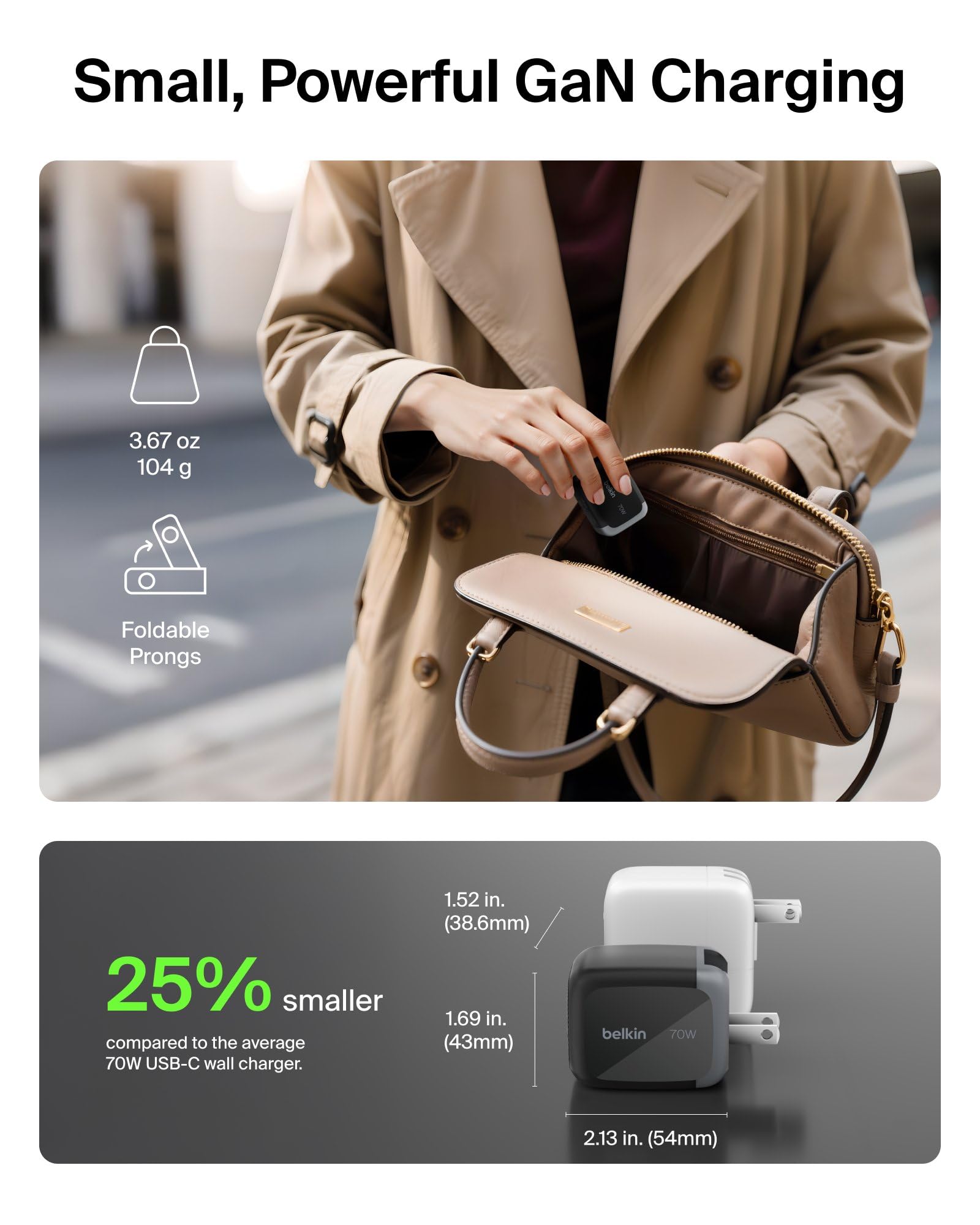 Belkin 3-Port USB C Charger Block 70W, Multi-Port GaN Wall Charger w/ 2X USB C Ports & 1x USB A Port, Fast Charging for MacBook, iPhone 17, iPad Pro, Samsung Galaxy S25, Google Pixel 10, & More