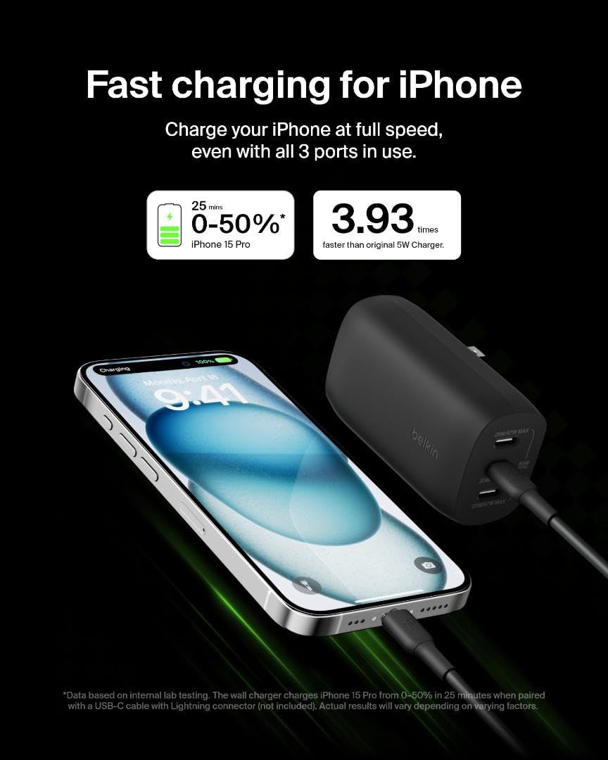 Belkin 3-Port USB C Charger Block w/PPS 67W, USB-C PD 3.1 Super Fast Charging - Samsung Galaxy S25, Apple iPhone 17, Air, Pro, Pro Max, MacBook, AirPods, Apple Watch, Nintendo Switch 2, etc. - Black—