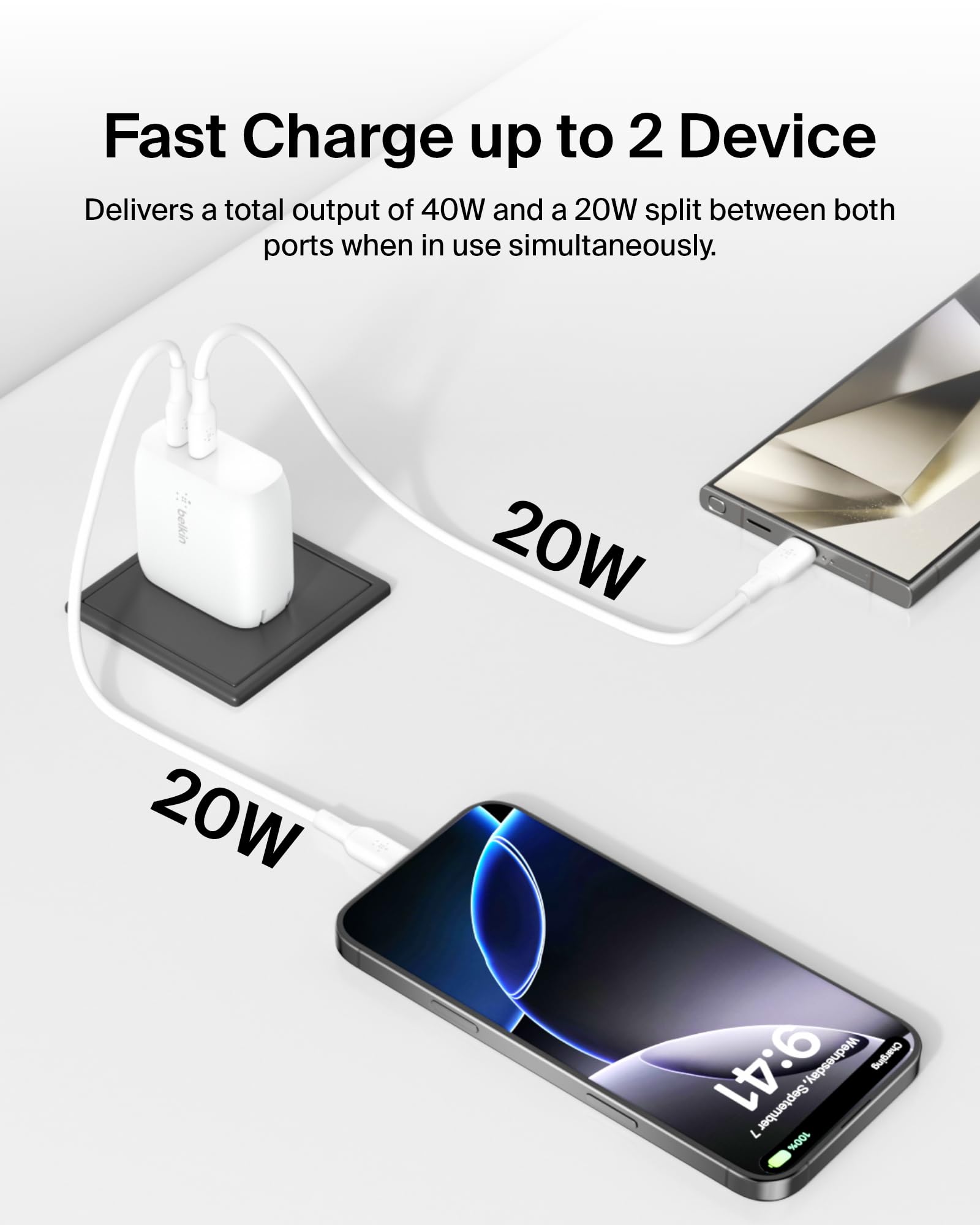 - DUAL PORTS OPTIMIZED FOR MOST DEVICES: This Belkin USB C wall charger is designed to efficiently charge iPhone 16, Samsung S25, and other PD-enabled devices. Experience a powerful one-charger solution for all of your electronics.