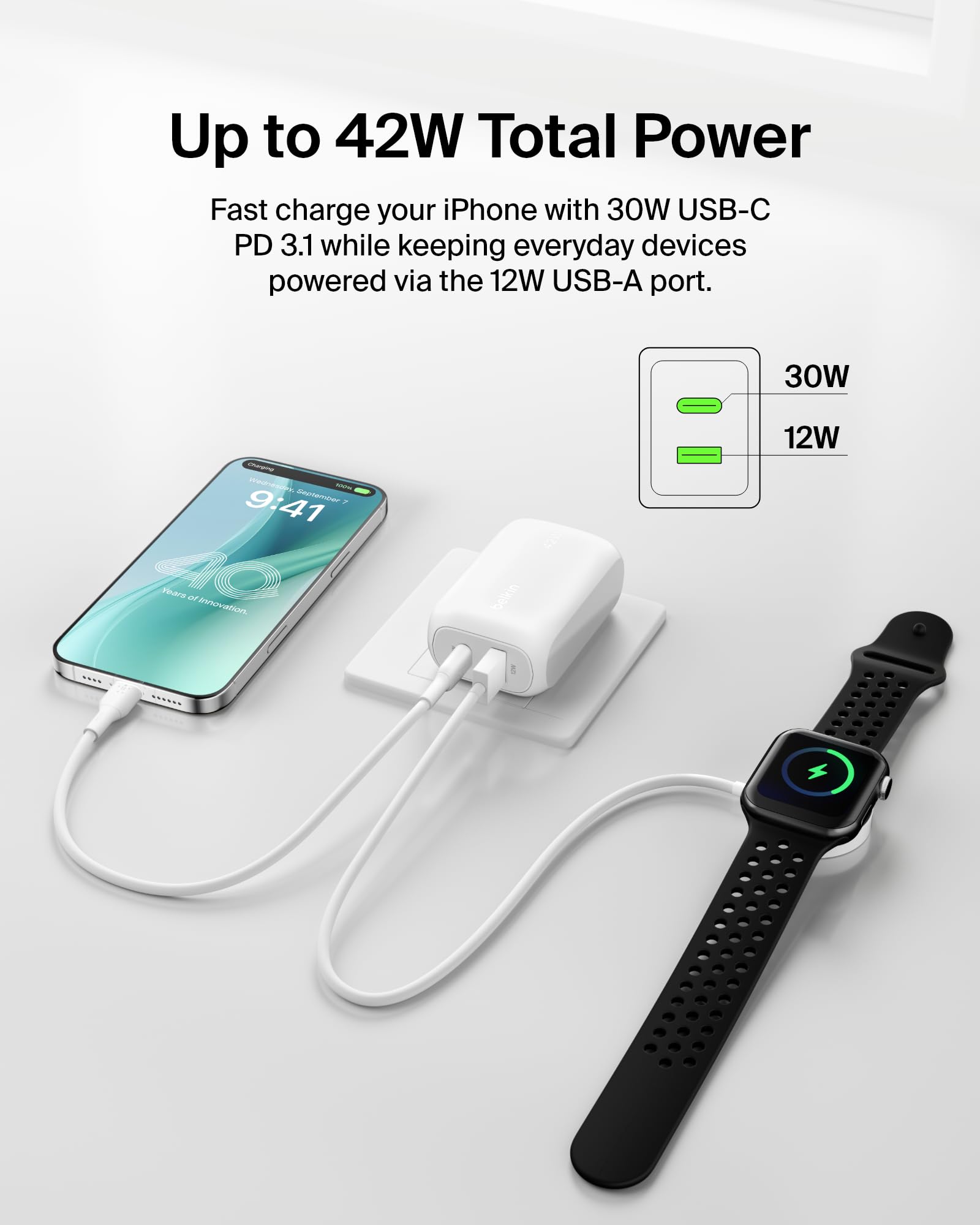 Belkin 42W Dual Port Charger Block, USB-C + USB-A Charger Super Fast Charging - Samsung Galaxy S25, Apple iPhone 17, Air, Pro, Pro Max, iPad, AirPods, Apple Watch, Nintendo Switch 2 & More - White