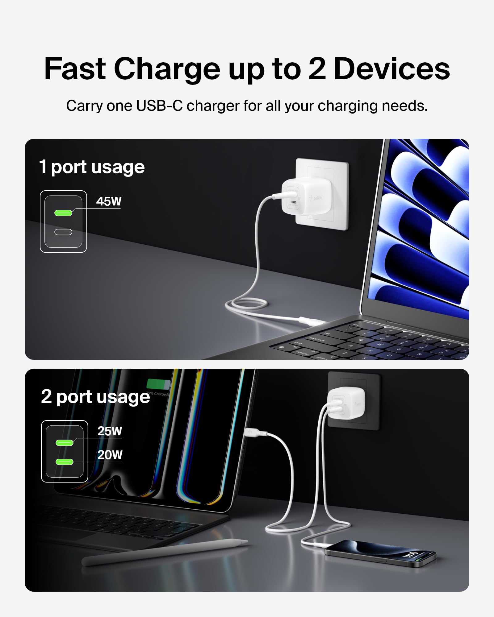 - SIMULTANEOUS CHARGING: Compared to other chargers with only one charging port, this charger has 2x USB-C ports to access up to 45W when using a single USB-C port or 25W plus 20W when using both ports. Charge your MacBook, smartphone, and more simultaneously.