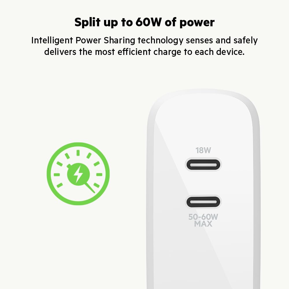 Belkin Dual Port USB C Charger Block 68W - USB C Cable Included (2M) - GaN w/ PD iPhone Fast Charging - Samsung Galaxy S25, Apple iPhone 17, Air, Pro, iPad, AirPods, Macbook, Nintendo Switch 2 – White