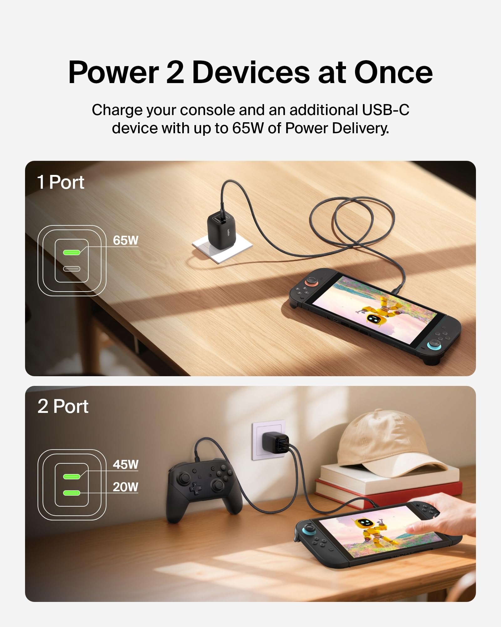 - FAST CHARGING TECHNOLOGY W/ 2 PORTS: Wall charger is optimized to rapidly charge your Nintendo Switch 2 up to 65W through a single port, or 45W and 20W when you charge your Switch and controllers or headphones; also charges your phone, laptop, and more.