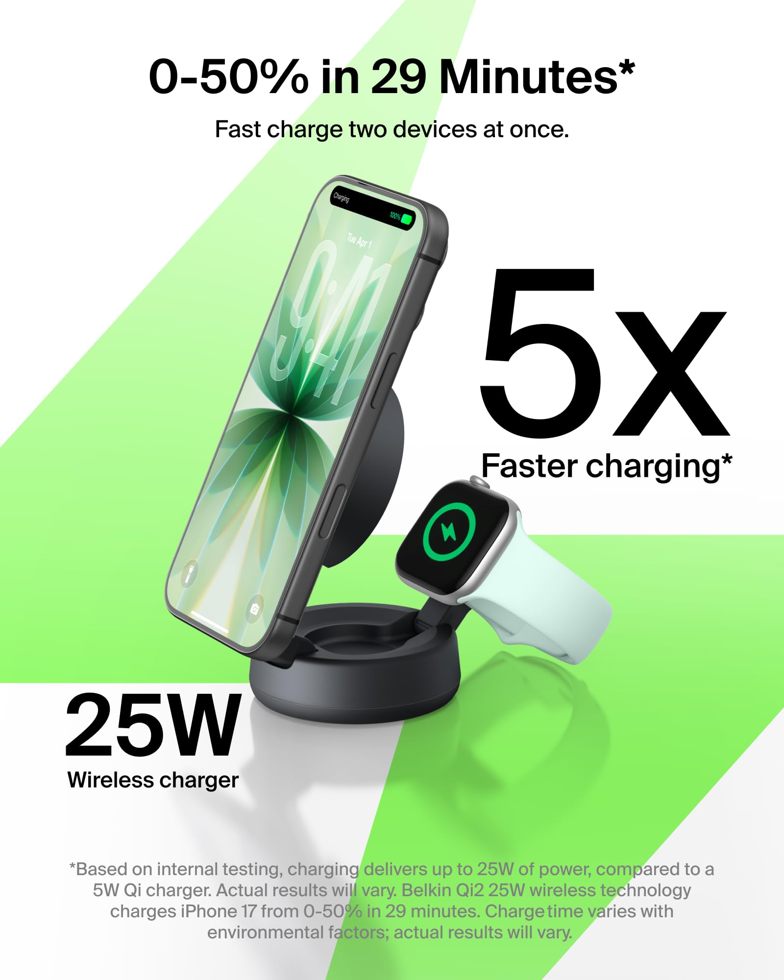 - ULTRA-FAST CHARGING: With wireless charging now as fast as wired, you can charge iPhone from 0-50% in 30 minutes** and Apple Watch Series 10 from 0-80% in 25 minutes.*** The flexible fast charge puck for Apple Watch lets you view in portrait or landscape.