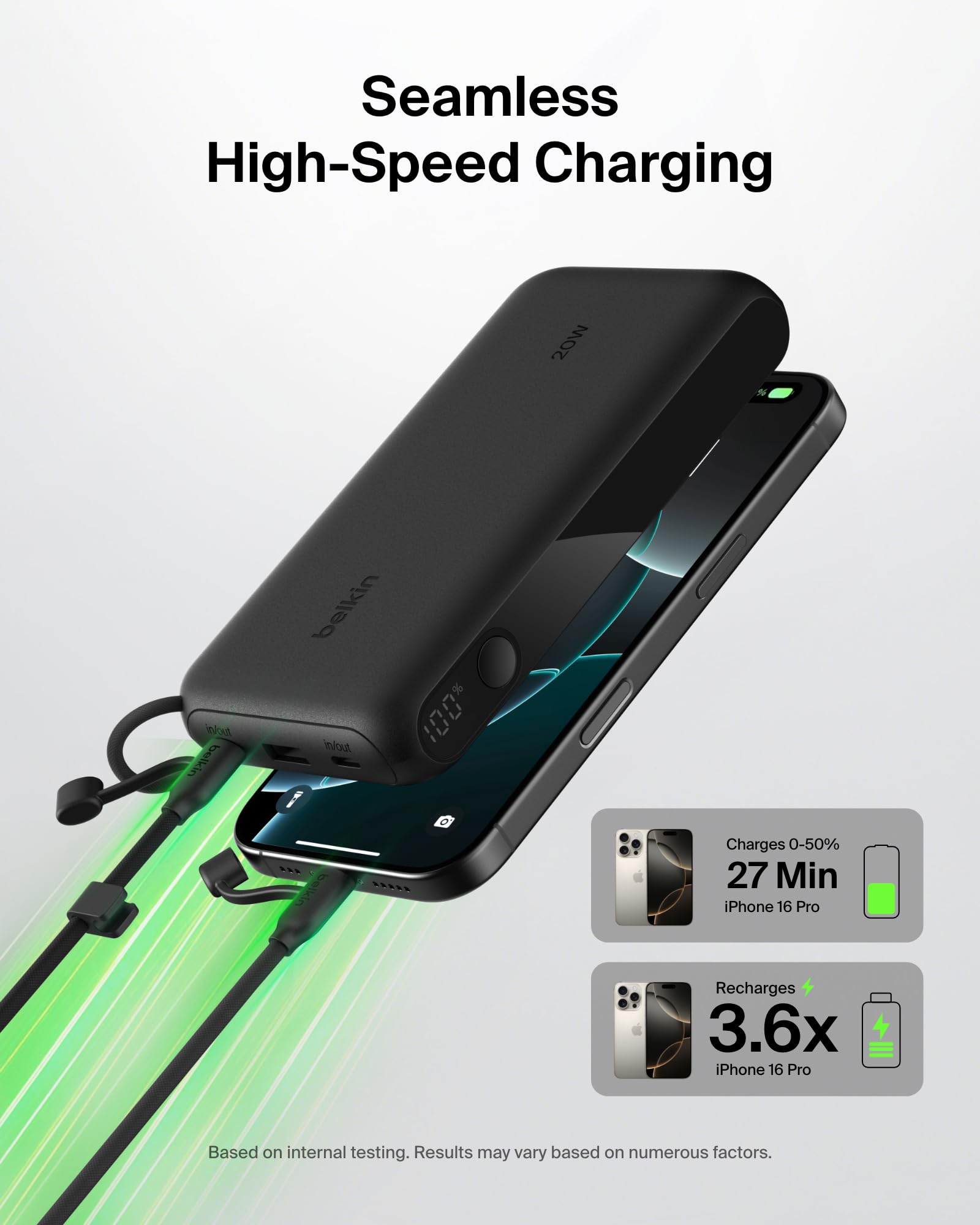 - FAST CHARGING FOR YOUR SMARTPHONE OR TABLET ON THE GO: This versatile power bank provides a 20W max output to recharge your iPhone, Galaxy, iPad, and more at home or on the go. Charge an iPhone 16 Pro from 0-50% in as little as 25 minutes.