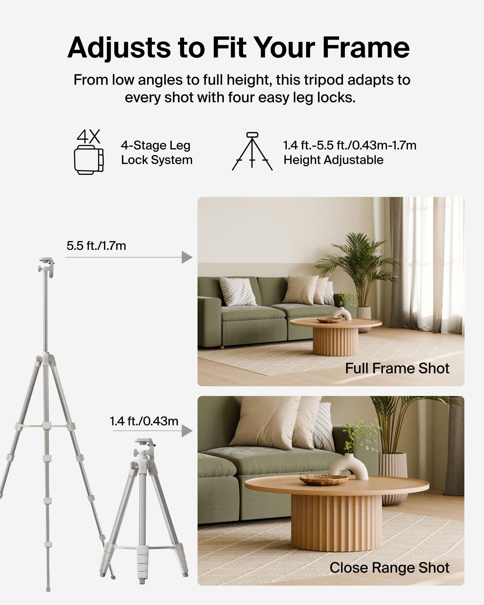 - ADJUSTABLE HEIGHT FOR EVERY ANGLE: This tripod easily adjusts from 1.4ft to 5.5ft (0.43m-1.7m) with 4 secure leg locks, giving you flexible height options for tabletop shoots, full-body framing, overhead content, and more.