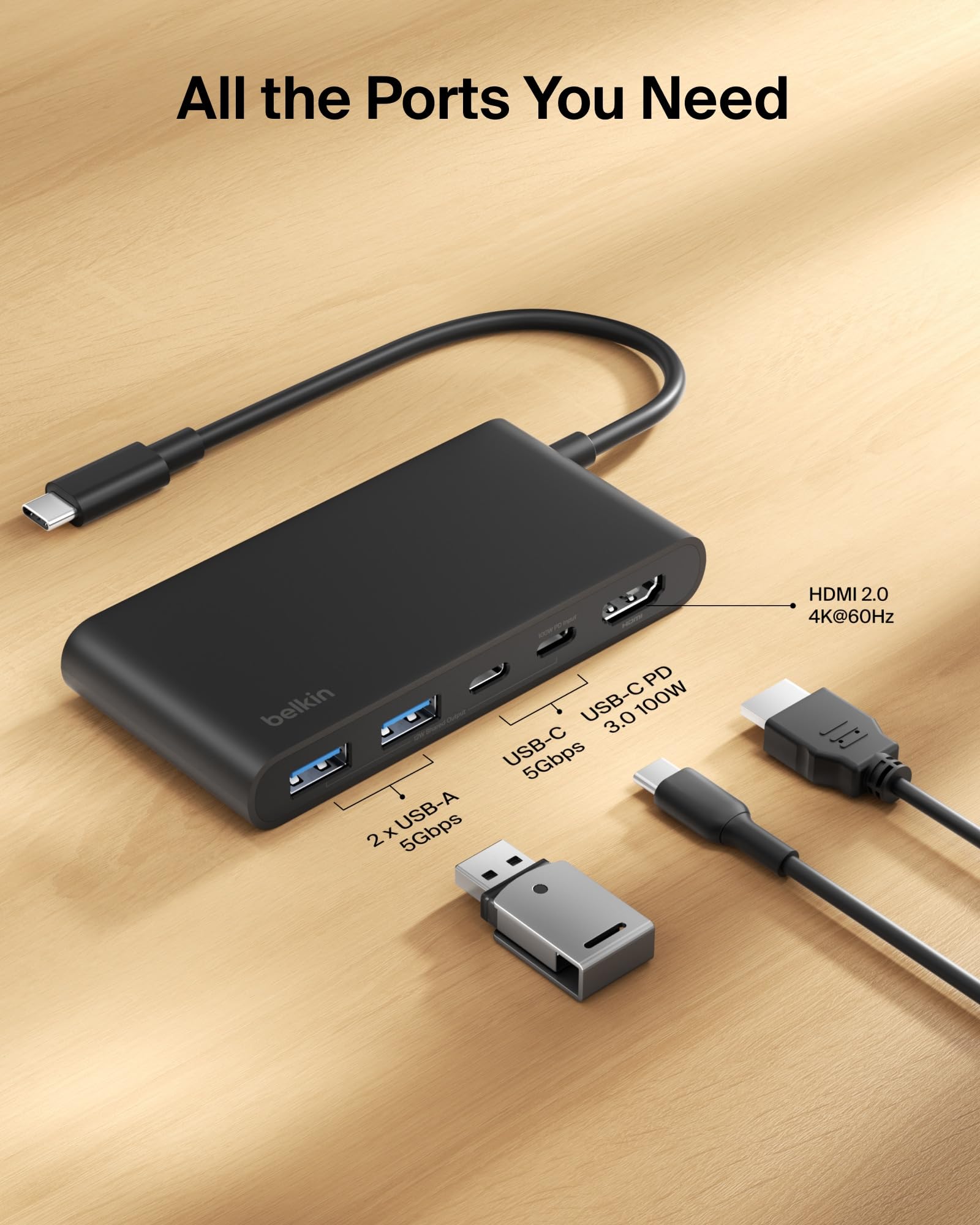 Belkin USB C Hub, 5-Port Hub With 4K HDMI Display @ 60Hz, 100W Power Delivery, Fast Data Transfer 5Gbps, USB C Multiport Adapter for iPad Pro, Chromebook & More, MacBook Accessories with HDMI 2.0 port